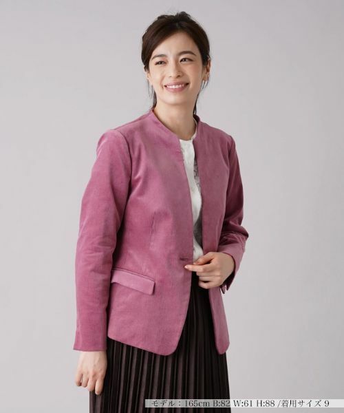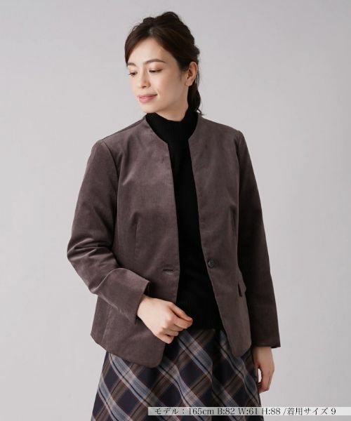 しっとりとした繊細な細畝のコーデュロイ生地で仕立てたノーカラージャケット。シーズンらしい素材感で旬の感度をアピールできるアイテムとなっています。ノーカラーのシャープなネックラインが絶妙な抜け感を演出。すっきりとウエストシェイプしたメリハリのあるシルエットが大人の女性らしい洗練された佇まいを叶えます。袖口の重ねスリットがさりげないアクセントに。オーソドックスなパンツスタイルはもちろん、ロングスカートに合わせた大人フェミニンなコーディネートにもオススメです。