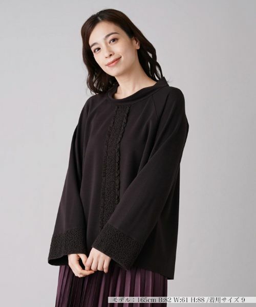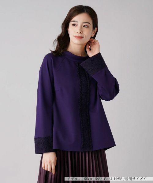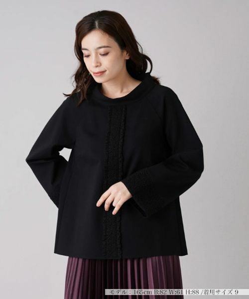 フロント中央のフリルや袖口を異素材で切り替え、独特な表情を作り出したハイネックカットソー。高さのあるネックがデコルテをさりげなくカバー。ゆったりとしたシルエットでリラックス感があり、レーヨンにナイロンを混紡した肌当たりのよい生地にはストレッチが効いているので着心地も快適。ロングスカートとも好相性で、大人フェミニンなコーディネートに仕上がります。