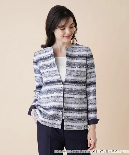 美しいボーダーを描き出す、繊細な織り地が印象的なノーカラージャケット。フロントはフック留めですっきりとした表情に仕上げました。ボディラインを引き立てるようなスマートなシルエットが上品さを感じさせてくれる一着です。袖口はスリット仕様で折り返しやすいデザインに。ワントーンのシンプルなボトムスに合わせるだけでもエレガントにまとまります。