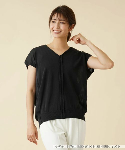 コットンベースのシアーニットでデザインした、清涼感溢れるVネックプルオーバー。ワイドに開いたネックラインがデコルテを覗かせ、絶妙な抜け感を作り出しています。肩をちょこんと覆うようなスリーブ、フロントやバックの切り替えなど、シンプルで終わらないさりげないディテールがこだわりを感じさせます。すっきりとしたボトムスでまとめると好バランスのコーディネートに。