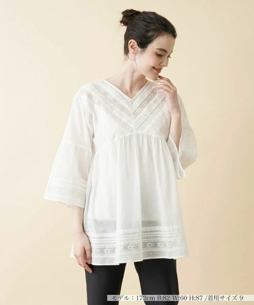 動くたびに軽やかに揺らめく、薄手のコットン生地で仕立てたチュニックブラウス。繊細なレースやピンタックを巧みに組み合わせ、フォークロア調のテイストでデザインしました。袖と身頃のシルエットにはゆとりをもたせ、風通しよくリラクシーな雰囲気に。これからの季節の大人ガーリーなカジュアルスタイルに品よく取り入れられる一枚となっています。