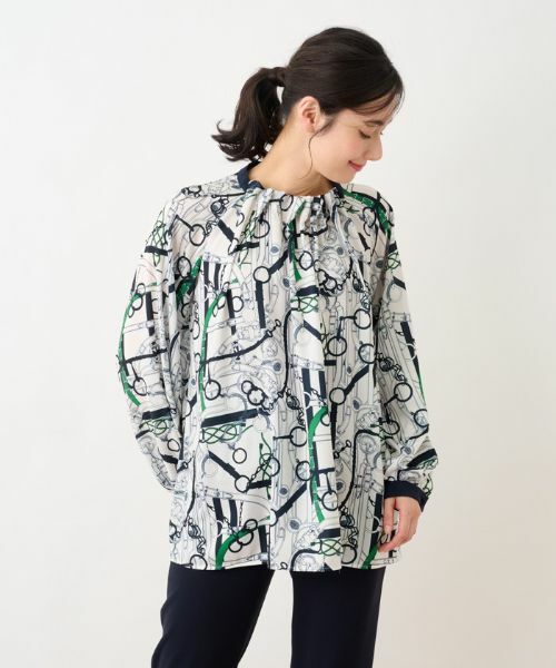アンティーク調のベルトチェーン柄をプリントしたオーバーブラウス。イタリア製の落ち感のあるポリエステルデシン素材を使用しています。襟ぐりと袖口には贅沢なギャザーワークを施し、サイドからバックネックは配色でメリハリ感をプラス。袖はラグランスリーブで仕上げており、ゆったりとした柔らかなシルエットでデザインしました。ボトムスに合わせてイン・アウトしてコーディネートをお楽しみいただけます。バックファスナーあり。