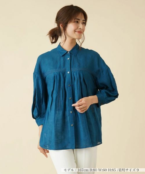 ほんのりシアーな美しい風合いが魅力的な麻素材の七分袖ブラウス。コンパクトな襟や、フロントヨークの切り替えにレーステープをあしらった、上品さのあるデザインです。ドロップショルダーやボディラインを拾わないふんわりとしたボリューム感のあるシルエットなので、肌離れが良くこれからの季節にぴったりのアイテム。ヒップの隠れる丈感なので、パンツと合わせてもすっきりとまとまります。