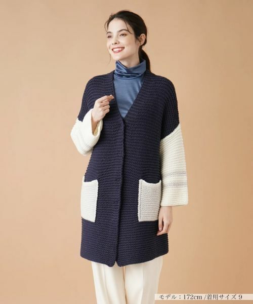 ざっくりとローゲージで編み込んだ、カラーブロックデザインのニットカーディガン。コントラストの効いた配色がインパクトを放ちます。袖にはラインをあしらい、さりげないアクセントに。シルエットはドロップショルダーでゆったりと落ち感をもたせ、リラクシーな着心地を叶えました。ヒップまで隠れるセミロング丈なので、すっきりとしたパンツを合わせた際もナチュラルに体型カバーしてくれます。フロントはスナップボタンにより開閉が可能。
