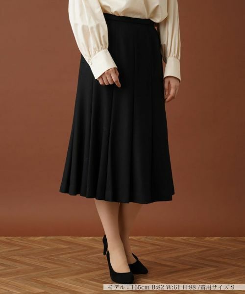 巧妙なバランスのプリーツが清楚な女性らしさを引き立てる、ミモレ丈のセミフレアスカート。広がりすぎない控えめのシルエットだから甘くなりすぎず、大人のデイリーカジュアルにもスムーズに調和します。ウエストには程よい伸縮性をもたせているので心地よくフィット。秋冬らしいクラス感を意識したトラッドレディなコーディネートにもおすすめです。ホック&ファスナーにより着脱が可能。------------------------------------着用シーズン:冬伸縮性:なし透け感:なしポケット:なし生地の厚さ:やや薄手裏地:ありウエスト:伸縮性あり-------------------------------------※商品の色味は、撮影場所や光のあたり具合、お客様のお使いの機器により色味が違って見える場合がございます。予めご了承ください。家庭洗濯不可漂白不可タンブル乾燥不可アイロン低温160℃までドライクリーニング可ウェットクリーニング不可