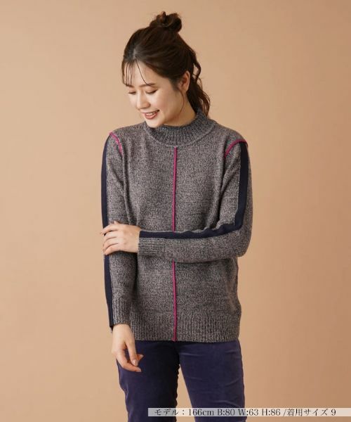 ナチュラルな温かみを感じさせる、ミックスヤーンのハイネックニットプルオーバー。ショルダーからスリーブに施した配色ライン、袖付けやフロント中央のカラーパイピングが存在感のあるアクセントに。高さのあるネックがスタイリッシュな雰囲気を演出。すっきりとしたシルエットで様々なボトムスとコーディネートしやすく、着回し力にも優れたトップスです。------------------------------------着用シーズン:秋伸縮性:あり透け感:なしポケット:なし生地の厚さ:厚手裏地:なし-------------------------------------※商品の色味は、撮影場所や光のあたり具合、お客様のお使いの機器により色味が違って見える場合がございます。予めご了承ください。※定価(税込)は、2024年1月2日のセール開始前の店舗における販売価格です。家庭洗濯不可漂白不可タンブル乾燥不可アイロン低温120℃まで石油系溶剤ドライクリーニング弱ウェットクリーニング不可