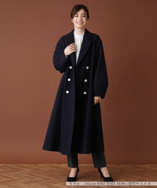 保温性の高い厚手の生地を使用した、ダブルブレステッド仕様のロングコート。ドロップショルダーとふっくらとしたボリュームスリーブでリラクシーな雰囲気に。バックウエストは高め位置にボタンを配し、スタイルアップ効果を演出。ややウエストシェイプしつつ、裾に向かってフレアに広がりをもたせることで美しいシルエットを作り出しています。ベーシック見えしながらも、さりげないディテールに個性が光る技ありのアウターです。