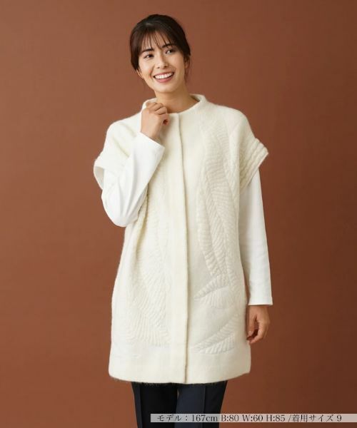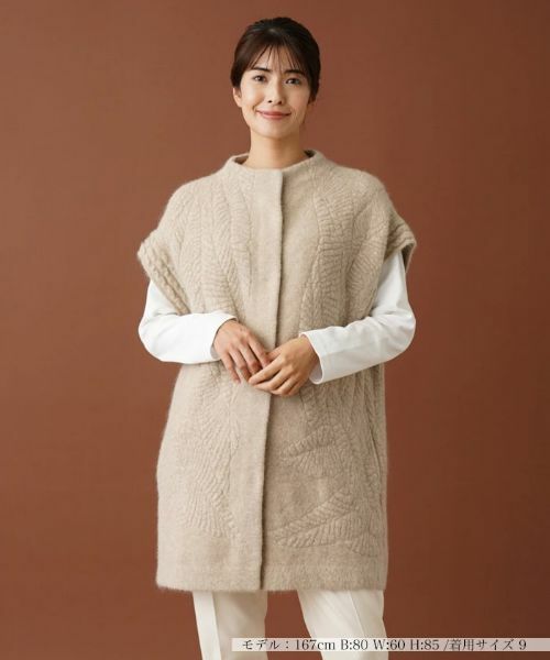 レリーフを思わせるボタニカル調の模様が浮かぶロングニットベスト。モヘヤをブレンドしたニットの優しい温もりが感じられるアイテムで、お手持ちのニットやカットソーとのレイヤードスタイルが手軽に楽しめます。大人の女性らしい上品な印象を与えるボトルネックタイプ。ショルダーラインをカバーするようなゆったりとしたシルエットでリラックス感たっぷり。フロントはスナップボタンによりスムーズに着脱が可能です。