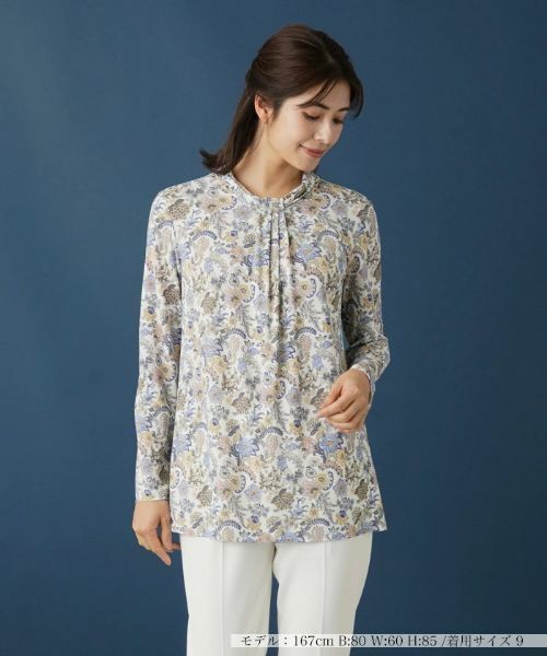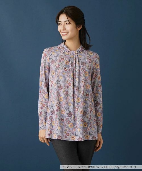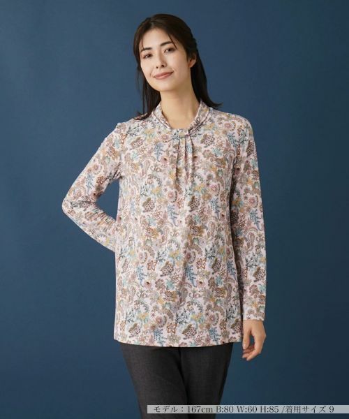 ペールトーンで繊細に描かれたボタニカル柄のプリントがこれからの季節らしい表情を見せるカットソー。ボウタイをキュッと結んだようなドレーピーなネックデザインも相俟ってさりげなく優雅さを感じさせます。生地には適度にストレッチが効いているので着心地がよく、一枚での着こなしはもちろん、アウターインでも重宝しそうです。ヒップまで隠れる程度の丈感でナチュラルに体型カバーできるのも嬉しいポイント。
