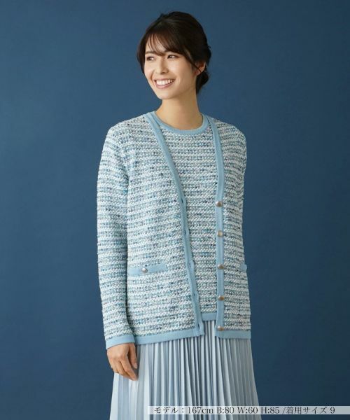 味わい深い表情を織りなすツイードライクなニット素材のVネックカーディガン。フロントやポケットにあしらったクラシカルな雰囲気のボタンがきらりと光り、さりげなくこだわりを感じさせるアクセントに。いつもの着こなしにプラスするだけで、大人の女性らしいほんのりクラシックな雰囲気が漂うカジュアルスタイルに仕上がります。別売りのニットインナーとのアンサンブルも楽しめます。
