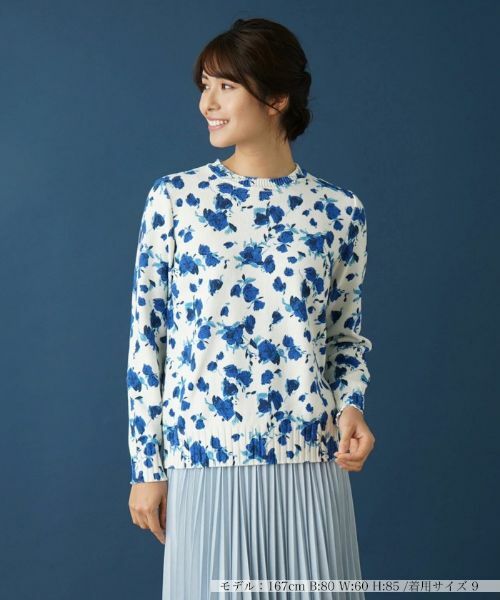 華やぎ溢れるローズ柄を全体にプリントした、クルーネックニットプルオーバー。優しい温もりが感じられるさらりとしたやや厚手のコットンニットで、ロングシーズン活躍してくれそうなトップスです。シンプルなパンツやフェミニンなロングスカートにコーディネートするだけで、ワンランク上のエレガントなカジュアルルックが楽しめそうです。------------------------------------着用シーズン:春伸縮性:あり透け感:なしポケット:なし生地の厚さ:やや厚手裏地:なし-------------------------------------※商品の色味は、撮影場所や光のあたり具合、お客様のお使いの機器により色味が違って見える場合がございます。予めご了承ください。家庭洗濯不可漂白不可タンブル乾燥不可アイロン低温210℃まで石油系溶剤ドライクリーニング弱ウェットクリーニング不可