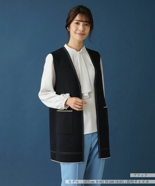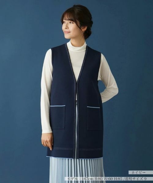 程よい厚みのあるダブルフェイス素材のニットベスト。すとんとした無駄のないロングシルエットが縦ラインを強調してくれるからスタイルアップも期待できそうです。さりげない配色ステッチやトリミングが爽やかなアクセントになり、クリーンなイメージを高めます。フロントは鍵ホック仕様ですっきりとした印象に。オンオフのシーンを選ばず、きちんと感のある大人の女性らしい着こなしが楽しめるアイテムです。
