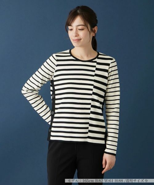 ボーダーのピッチを切り替えた、クレイジーパターンが新鮮なインパクトを放つニットプルオーバー。定番のボーダーを個性溢れるルックスにシフトした柄は、これからの季節のコーディネートを表情豊かにアップデートしてくれそうです。サイドにはリズミカルにボタンをあしらい、絶妙なバランスのアクセントに。シンプルになりがちなデイリースタイルにモダンなエッセンスを加えてくれる、さりげない小技の光るアイテムです。サイドボタンは開閉が可能。
