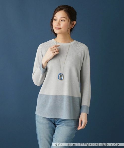 袖口や裾周りに色の変化を加えた、バイカラーのニットプルオーバー。シンプルながらコーディネートにメリハリを演出でき、さりげなくお洒落に差をつけてくれるデザインです。リラックス感のあるシルエットとヒップ周りまで届くやや長めの着丈で、ナチュラルに体型カバーできるのも嬉しいポイント。レーヨンにナイロンをブレンドして丁寧に編み込んだ、ニットの優しい風合いが感じられる一枚です。------------------------------------着用シーズン:初夏伸縮性:あり透け感:ありポケット:なし生地の厚さ:やや厚手お取扱い方法:ウォッシャブル(手洗い可)-------------------------------------※商品の色味は、撮影場所や光のあたり具合、お客様のお使いの機器により色味が違って見える場合がございます。予めご了承ください。手洗い可漂白不可タンブル乾燥不可つり干し(日陰)アイロン低温160℃まで石油系溶剤ドライクリーニング弱ウェットクリーニング(弱い処理)