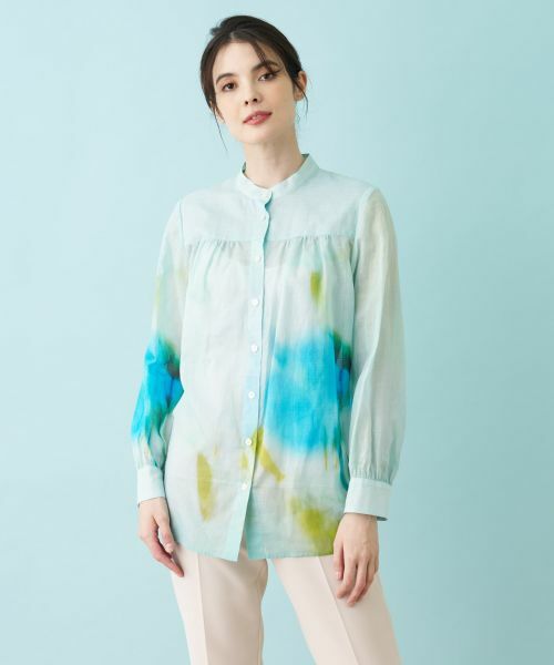薄く透け感のある素材を使用した長袖の前開きブラウス。プリント柄なので透けすぎず、程よいシアー感を楽しんでいただけます。首元をすっきりと見せてくれるバンドカラーが、きちんと感もありつつ程よくカジュアルに着用できます。素材が薄いため、ゆとりのあるサイズがおすすめです。自宅で手洗い可能なイージーケアアイテム。