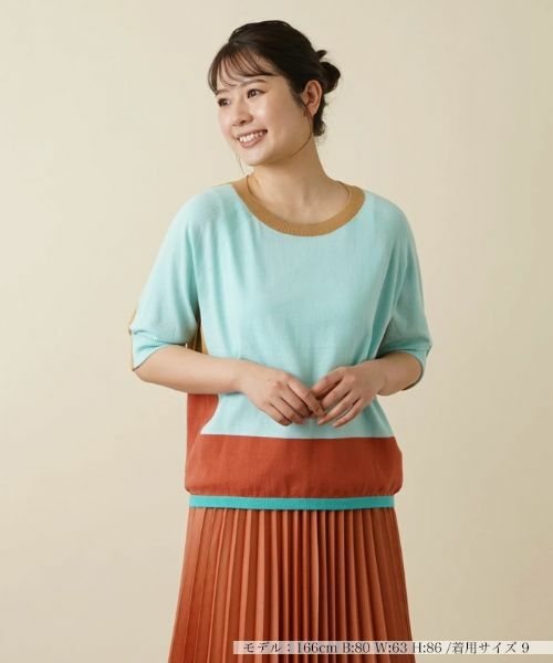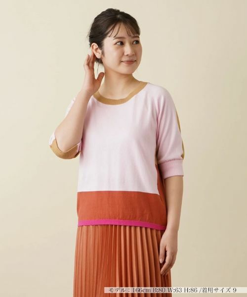 これからの季節らしいトレンドを反映したカラーブロッキングデザインの五分袖ニットプルオーバー。ハイゲージニットの滑らかな質感が美しく、さらりとした着心地で一枚でのスタイリングを楽しみたくなるアイテムです。明るめの色と落ち着いた色のカラーコンビネーションが絶妙なバランスのアクセントに。ワイドパンツなどのボリューム感のあるボトムスを組み合わせることで、リラックス感がありながらも洗練された印象のスタイリングが完成します。