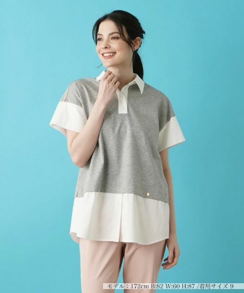 カラー&ヘム、袖部分をシャツ素材で切り替えた、レイヤード風デザインの半袖プルオーバー。ソフトな質感の生地は肌当たりがよく、これからの季節にぴったり。シルエットには程よくゆとりをもたせ、上品さの中にも程よいリラックス感が感じられる印象に。シンプルなパンツとコーディネートするだけで、ひと味違った上級者らしいスタイルを手軽に楽しめるエフォートレスなアイテムです。