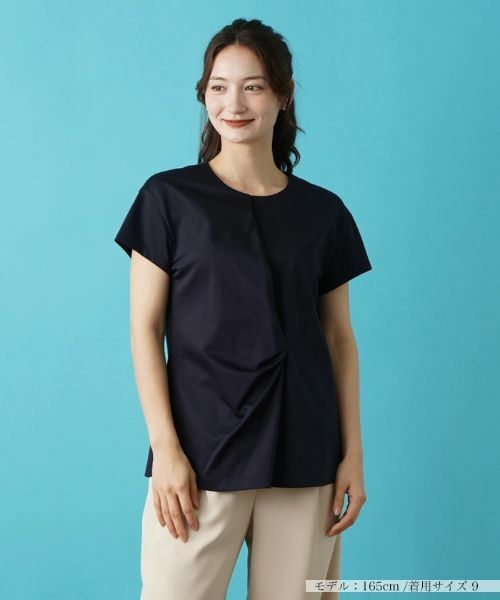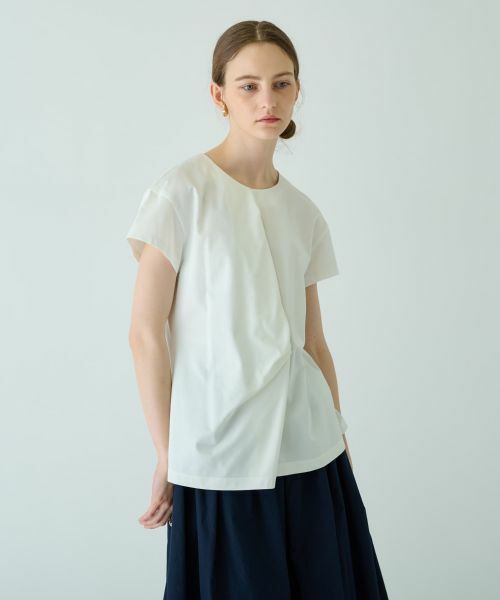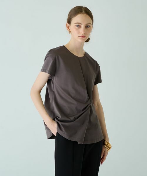 フロントをアシンメトリーに重ね合わせて、更にこなれ感漂うタックを施した半袖カットソー。ほんのり優しい光沢のある生地を使用しているからカジュアルに寄りすぎることなく、大人のデイリースタイルにもマッチ。