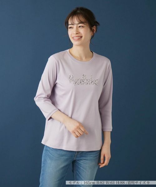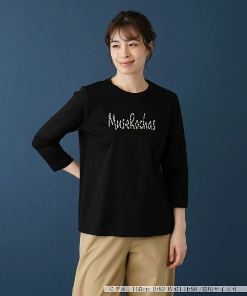 柔らかなコットン素材が快適な着心地を提供する、肌馴染みのよい七分袖カットソー。ジャケットやカーディガンとの重ね着にも使える着回し力に優れたアイテムです。フロントに施された“MUSE ROCHAS”のロゴプリントにパール調のビジューを添えることで、上品ながらも遊び心ある仕上がりに。大人の可愛らしさをさりげなく演出し、これからの季節のカジュアルスタイルに新鮮なアクセントを加えてくれそうな一枚です。