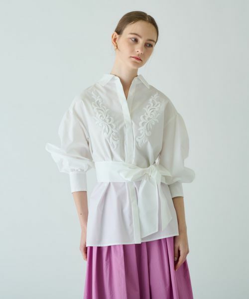 胸元にあしらったレースモチーフやきゅっと結ばれた大きなリボンタイなど、上品で華やかなディテールがドレッシーに映える長袖ブラウス。キレイめボトムスとのレディなコーディネートはもちろん、デニムパンツであえてカジュアルダウンさせても素敵。