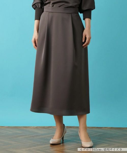 しっとりとした光沢が美しいサテン素材が、毎日のスタイリングにエレガンスを添えてくれるミモレ丈スカート。ウエスト周りに施したタックが、きちんと感をいざないます。別売りのブラウスと合わせれば、セットアップとしても楽しめる一着。------------------------------------着用シーズン:初夏 伸縮性:なし透け感:なしポケット:なし生地の厚さ:やや薄手お取扱い方法:ウォッシャブル(手洗い可)裏地:ありウエスト:後のみゴム-------------------------------------※商品の色味は、撮影場所や光のあたり具合、お客様のお使いの機器により色味が違って見える場合がございます。予めご了承ください。※こちらの商品はボトムス単品でのお届けになります。手洗い可酸素系漂白可タンブル乾燥不可つり干し(日陰)アイロン低温120℃までドライクリーニング可ウェットクリーニング(弱い処理)
