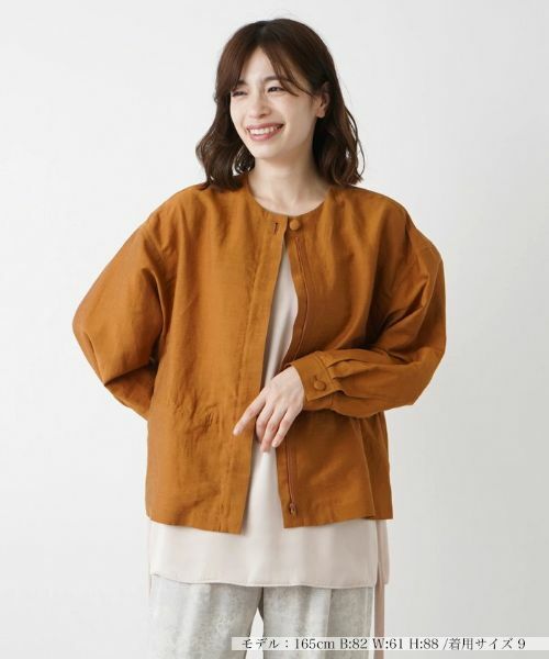 通気性に優れた麻ベースのテキスタイルで仕立てたノーカラーブルゾン。ウエスト内側のドローストリングで絞りを調節することでメリハリのあるシルエットが楽しめます。ドロップショルダーが適度なリラックス感を作り、軽やかに羽織るだけで旬のコーディネートが完成。カジュアルなデニムパンツからエレガントなスカートまで幅広いスタイルにマッチし、いつでもさらりと爽やかにスタイリングできるアウターです。フロントはボタン+ファスナー仕様でスムーズに着脱が可能。