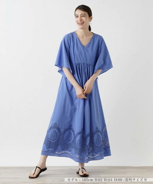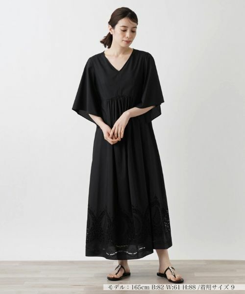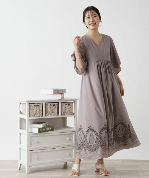 スリット入りのボリューミーなスリーブが抜け感と優雅さを演出する、リラクシーなシルエットのマキシワンピース。シャープなVネックがデコルテを美しく見せ、ヘルシーな女性らしさを引き立てます。裾周りにはオリエンタルムードを漂わせるペイズリー柄のカットワーク刺繍が施され、細部にまでこだわったデザインが魅力的。一枚で瀟洒な雰囲気のコーディネートが手軽に完成するので、デイリーからオフィスカジュアル、お出かけまで多彩なシーンで活躍してくれそうです。合わせるアクセサリーやシューズ次第で、カジュアルにもエレガントにもアレンジが楽しめます。バックファスナーにより開閉が可能。