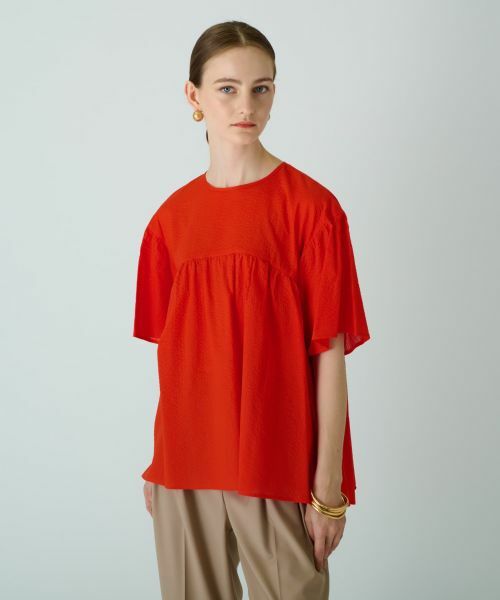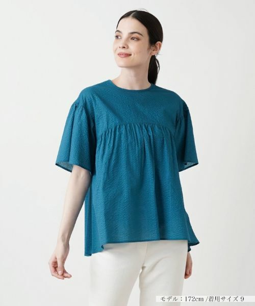 清涼感のあるやや薄手の表面感のある生地を使用したオーバーブラウス。巧妙な切り替えでゆったりとしたシルエットを作り、ギャザーをたっぷりと施すことで、柔らかな表情を生み出しています。身体のラインを拾いにくく、ヒップまで隠れるのでナチュラルに体形カバーできるのも嬉しいポイント。シンプルなデザインで合わせやすく、着回し力にも優れています。バックネック中央の涙あきはボタンにより開閉が可能。