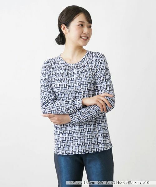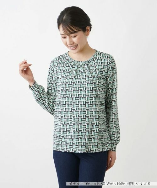 グラフィカルな幾何学柄をプリントしたクルーネックブラウス。大人の個性がさりげなく引き立ち、ひと味違った旬のスタイリングを演出。ネックはすっきりと開き、袖にふんわりと膨らみをもたせ、程よいリラックス感のあるシルエットに仕上げました。ネック周りや袖口にギャザーを施すことで柔らかな表情を作り出しています。バックネックには涙あきを採用し、ループボタンでの開閉が可能となり、後ろ姿にもアクセントを加えています。デイリーからオフィスカジュアルまで幅広く活躍し、コーディネートに自然と溶け込む一枚です。