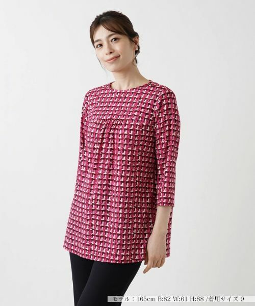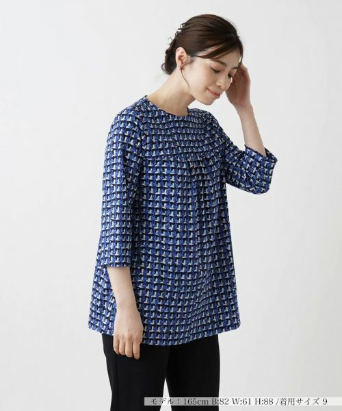 ざっくりとした風合いのツイードを思わせるフェイクプリントが、ひと味違った遊び心と個性を引き立てるクロップドスリーブのプルオーバー。絶妙なバランスでギャザーを施し、柔らかなニュアンスに。フロントヨークの切り替えから程よくフレアに仕上げたシルエットがさりげなくフェミニンムードを演出。身体のラインを拾いにくく、やや長めの丈感なので細身のパンツと合わせてもバランスよくまとまります。バックネックの涙あきはループボタンにより開閉が可能。