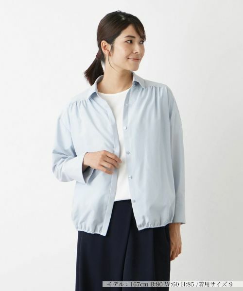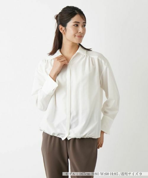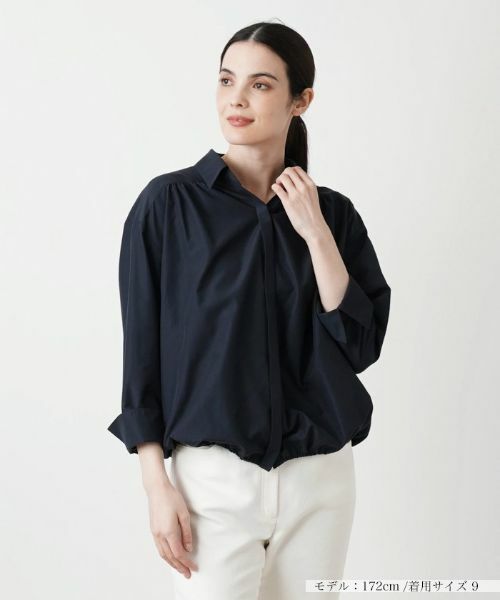 さらりとした上品な風合いが感じられる、やや薄手のコットン混生地を使用したブラウス。フロントボタンを隠した比翼仕立てですっきりとした印象に。前ショルダーやバックヨーク周りにはギャザーをたっぷりと施し、女性らしい柔らかな表情に仕上げました。裾はゴム(調整は不可)を通しているため適度なフィット感があり、ふんわりとしたシルエットを作り出します。カフス部分はスリット入りなので折り返してのアレンジも可能。パンツ、スカートを選ばずに合わせやすく、これからの季節の多彩なコーディネートで楽しめる一枚です。