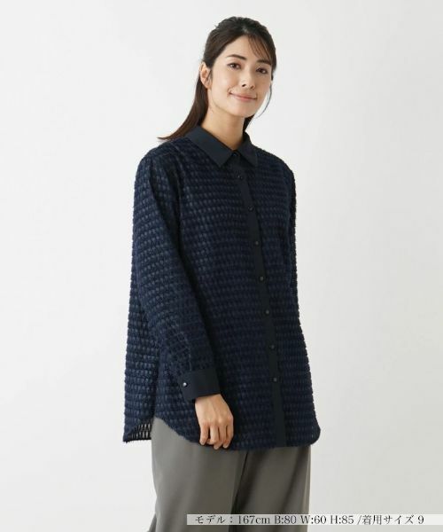 独特な表情のある風合い豊かなポリエステル生地を使用したブラウス。端正なフォルムの襟が顔周りをスマートに演出。落ち着いたシックなカラーでまとめているので目立ちすぎることなく、ボトムスを選ばずフレキシブルにコーディネートできる一枚。裾には深めのスリットを入れ、着こなしやすさにも配慮しています。身体のラインを拾いにくく、ヒップまで隠れる程度の丈感だから体形カバーもお手のもの。------------------------------------着用シーズン:夏伸縮性:なし透け感:ありポケット:なし生地の厚さ:薄手お取扱い方法:ウォッシャブル(手洗い可)裏地:なし-------------------------------------※商品の色味は、撮影場所や光のあたり具合、お客様のお使いの機器により色味が違って見える場合がございます。予めご了承ください。手洗い可酸素系漂白可タンブル乾燥不可つり干し(日陰)アイロン低温120℃までドライクリーニング可ウェットクリーニング(弱い処理)
