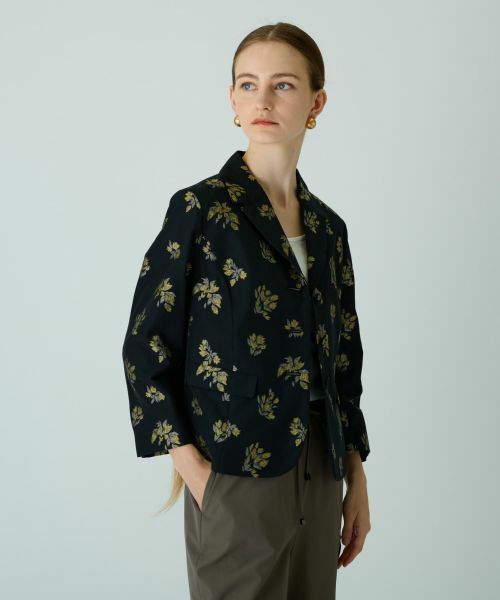 クラシカルな趣のボタニカル柄が浮かぶ、七分袖のテーラードジャケット。端正なフォルムのカラー&ラペルも相俟って、大人の女性らしい洗練された佇まいを演出。くるみボタンを採用し、細部までこだわりが感じられるデザインに。ポリエステルにコットンをブレンドしたやや薄手の生地を使用し、涼やかな着心地を叶えました。短めの丈感で合わせやすく、ワイドパンツやミモレスカートはもちろん、ロングワンピースとのレイヤードスタイルも様になります。------------------------------------着用シーズン:初夏 伸縮性:なし透け感:なしポケット:あり生地の厚さ:やや薄手-------------------------------------※商品の色味は、撮影場所や光のあたり具合、お客様のお使いの機器により色味が違って見える場合がございます。予めご了承ください。家庭洗濯不可漂白不可タンブル乾燥不可アイロン低温160℃までドライクリーニング可ウェットクリーニング不可