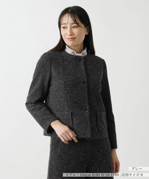 優しい温もりを感じさせる、ツイード生地を使用したノーカラージャケット。すっきりとしたコンパクトなシルエットで着こなしやすく、洗練された佇まいに仕上がります。前立てには大きめの丸ボタンを留め、前ウエスト左右にシンプルなスモールポケットをバランスよくレイアウトしています。オフィスから週末のお出かけまで多彩なシーンで重宝しそうなアイテム。同素材のボトムスとのセットアップでコーディネートするのもおすすめです。