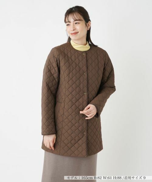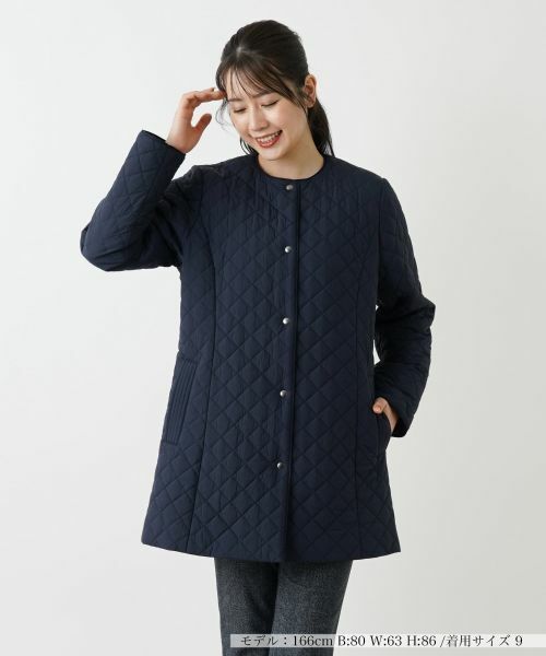 控えめなダイヤモンドキルティングが美しい、中わた入りのノーカラーコート。ボリュームを抑えつつも程よく広がりをもたせたシルエットで、身体のラインを拾わずナチュラルに体型をカバーしてくれます。フロントはスナップボタン仕様で、忙しい朝でもスムーズに着脱が可能。シンプルでありながら洗練されたデザインなので、デイリー使いはもちろん、オフィス通勤やきちんとしたシーンにも活躍する頼れる一着です。