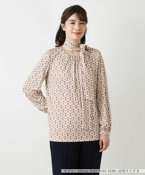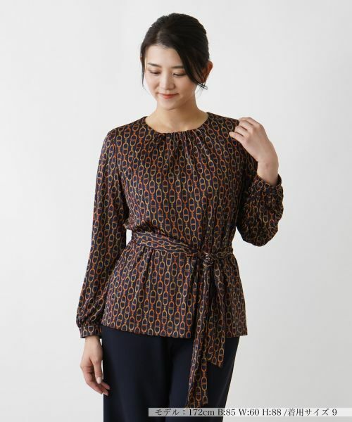 美しいグラデーションカラーを取り入れた、アンティーク調のチェーン柄がプリントされたプルオーバー。ハイウエストで共布ベルトをマークすればこなれ感のある上級者らしい着こなしに。ネック周りに結んでボウタイ風のアレンジも楽しめます。ワイドパンツでカジュアルに仕上げたり、ロングスカートを合わせてエレガントに着こなしたりとコーディネートも思いのまま。バックネックはループボタンにより開閉が可能です。