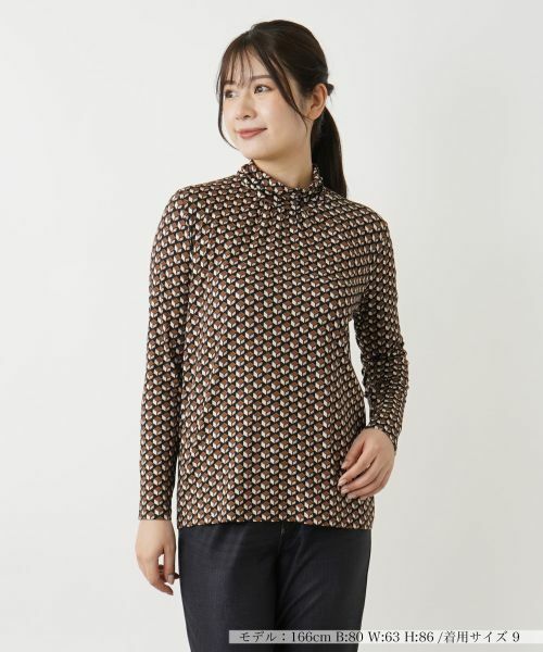 オプティカルな幾何学柄をプリントした、ハイネックカットソー。ネック周りにはナチュラルなドレープ感があり、柔らかなニュアンスに仕上がります。すっきりとしたシルエットでコーディネートしやすく、一枚での着こなしはもちろん、ジャケットやコートのインナーとしても活躍。しっとりとした優しい風合いのレーヨンベースの生地を使い、程よくストレッチが効いているので着心地も快適です。