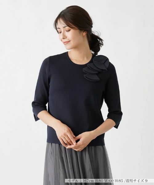 すっきりとしたシルエットでデザインした、やや薄手のクルーネックニットプルオーバー。クロップドスリーブの袖口にはスリットを入れ、さりげない抜け感を意識しています。左ショルダーにはタフタ素材のフラワーモチーフをあしらい、華やかさを引き立てるエッセンスに。モチーフは折り畳みのアレンジが可能です。フェミニンなスカートを合わせたスタイルはもちろん、ベーシックな定番のパンツルックにもよく似合います。------------------------------------着用シーズン:秋伸縮性:あり透け感:色によりありポケット:なし生地の厚さ:やや薄手付属品:モチーフ取り外し不可-------------------------------------※商品の色味は、撮影場所や光のあたり具合、お客様のお使いの機器により色味が違って見える場合がございます。予めご了承ください。家庭洗濯不可漂白不可タンブル乾燥不可アイロン低温160℃まで石油系溶剤ドライクリーニング弱ウェットクリーニング不可