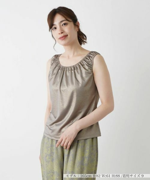 メタリックな輝きを放つ、ラメ混のポリエステル素材を使用したノースリーブカットソー。ネックラインやアームホールにギャザーを施し、柔らかなドレープ感を生み出しています。襟ぐりと袖口はゴム仕様で心地よいフィット感をもたせました。さっと一枚で着こなすだけで、大人のエレガンスが薫る旬のスタイリングが完成。シャツやカーディガンのインナーに取り入れても、コーディネートに差をつけてくれそうなアイテムです。