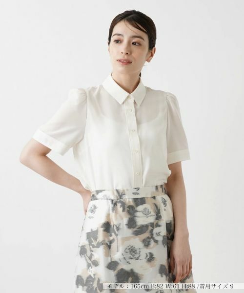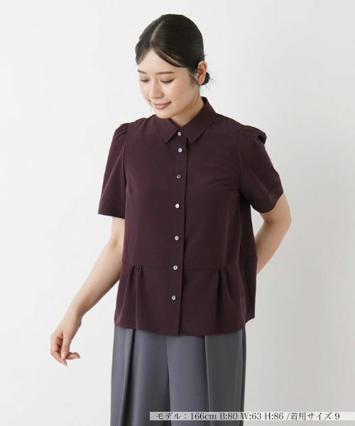 無駄な装飾を省いたシンプルな無地の襟付きブラウス。落ち感のあるやや薄手のポリエステル素材を使い、軽やかな着心地を叶えました。袖や裾周りにタック&ギャザーを施し、ふわりとしたシルエットでデザインすることで、フェミニンなニュアンスを醸し出しています。定番のワイドパンツやフェミニンなミモレスカートとのコーディネートもバランスよく仕上がり、デイリーからオフィスカジュアルまで幅広く活躍するアイテムです。