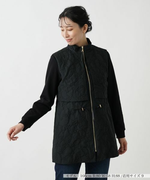 アンティーク調のボタニカル刺繍を施した格調高い趣のスタンドカラーベスト。上下でセパレートしたようなデザインで、ふわりと広がる裾のシルエットが新鮮さを感じさせます。フロントはジップアップ仕様でスムーズに着脱が可能。フェミニンなスカートでエレガントにスタイリングするのはもちろん、デニムなどのカジュアルなアイテムにもマッチします。ウエストはドローコードにより調整が行えます。