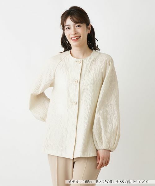 ゆったりとしたリラクシーなコクーンシルエットでデザインしたノーカラージャケット。凹凸とシワ感のある味わい深い表情のファブリックを使い、他にはないユニークな佇まいに。ふんわりと膨らみをもたせたバルーンスリーブの袖付けはラグランカットで仕上げ、肩肘張らないストレスフリーの着心地を叶えました。ヒップまで隠れる程度の丈感でナチュラルに体型カバーできるのも嬉しいポイント。