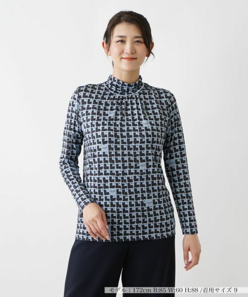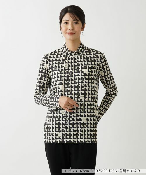 細部にロゴをちりばめたグラフィカルな総柄プリントが、新鮮なインパクトを放つハイネックカットソー。生地には適度なストレッチ性をもたせているので、すっきりとしたシルエットでありながらストレスフリーの着心地を実感できます。ネック周りにはギャザーを入れ、女性らしい柔らかなニュアンスに仕上げました。シンプルなワイドパンツやミモレスカートを合わせるだけで、コーディネートの主役として存在感を発揮するトップスです。