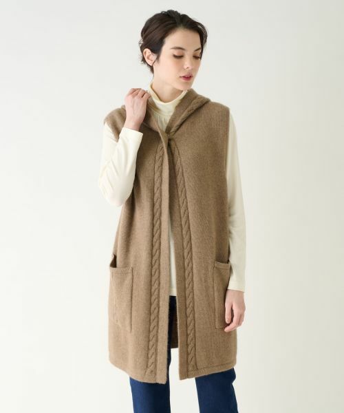 フードカラーのカシミヤニットジレ。前端と後ろ中心にケーブル編みを施しています。7Gでふんわりと編まれているので空気を含み軽く暖かいのが特長。こちらのカシミヤは、原毛を洗毛から染色・紡績・編立・検品まで一気通貫でモンゴルで行っています。モンゴルのカシミヤ山羊は冬は‐40°と厳しい寒さの中で生活しているため外毛の内側にびっしりと産毛を蓄えます。そのため繊維長が長く細番手で柔らかいのが特長。