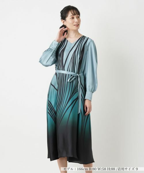 グラデーション調の色使いに、グラフィカルな柄のプリントが映えるVネックフレアワンピース。すっきりと開いたネックラインがデコルテを覗かせ、開放的なムードを演出。袖には程よくボリュームをもたせ、裾に向かって緩やかなドレープ感のある美しいシルエットを描き、リラクシーな表情を生み出しています。ハイウエストで共布ベルトをマークすればメリハリの効いたスタイリングが完成します。セットアップ可能。------------------------------------着用シーズン:冬伸縮性:なし透け感:なしポケット:なし生地の厚さ:やや薄手裏地:あり付属品:ベルト取り外し可-------------------------------------※商品の色味は、撮影場所や光のあたり具合、お客様のお使いの機器により色味が違って見える場合がございます。予めご了承ください。家庭洗濯不可漂白不可タンブル乾燥不可アイロン低温120℃まで石油系溶剤ドライクリーニング弱ウェットクリーニング不可
