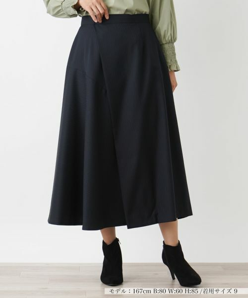 細やかなストライプ生地を使用したロング丈のラップスカート。フロントで生地を合わせるデザインがさりげなくこなれ感を演出します。シルエットは程よくウエストシェイプしつつ、裾に向かって広がりをもたせ、大人の女性らしいエレガントな雰囲気に。バックウエストはゴム仕様で心地よくフィット。落ち着いたシックな色合いでトップスとも合わせやすく、タックインすれば脚長見せのスタイルアップ効果も狙えそうです。