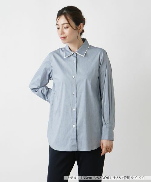 さりげなく配色のアクセントを加えた、形の良いレイヤード風の襟がポイントになったブラウス。袖には程よくボリューム感をもたせ、肩肘張らないリラクシーな着心地を叶えました。コットンにナイロンをブレンドした爽やかな風合いの生地を使い、適度にストレッチを効かせているので着心地も快適。すっきりとしたパンツでまとめるのはもちろん、フェミニンスカートを合わせたキレイめのコーディネートにも好相性のトップスです。