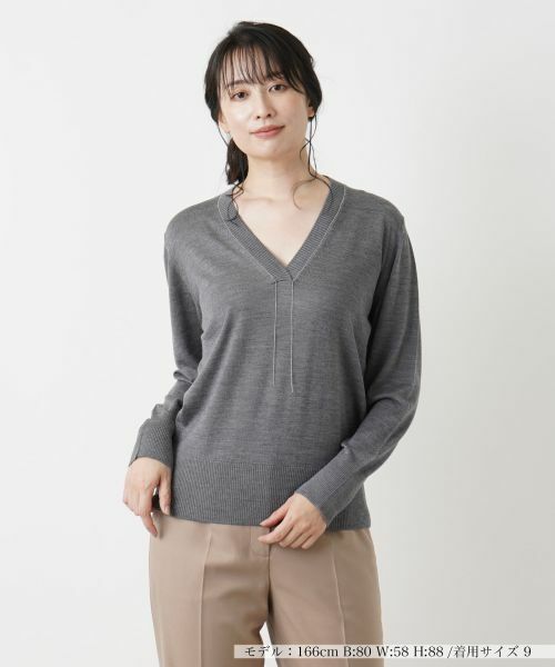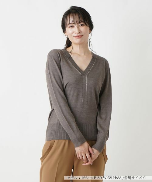 ボールチェーンのトリミングがアクセントになったVネックニットプルオーバー。シルクをブレンドして丁寧に編み込んだニットの上品な風合いが心地よい一枚。ワイドに開いたネックラインがデコルテを覗かせ、抜け感のある着こなしを演出。シルエットはドロップショルダーでゆとりをもたせ、リラックス感のある着心地を叶えました。カジュアルなワイドパンツでまとめるのはもちろん、フェミニンなスカートを合わせたスタイリングもおすすめです。