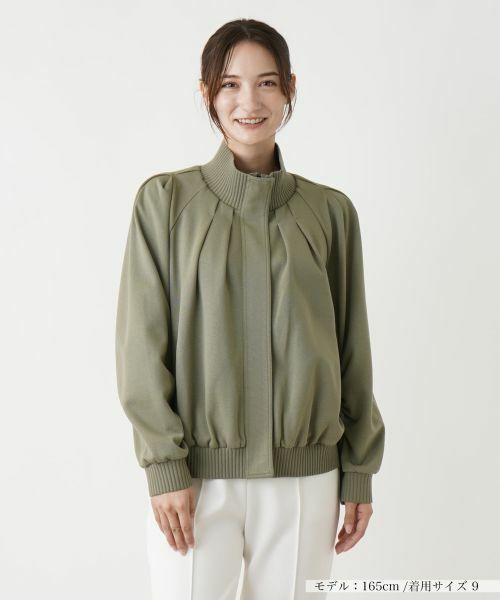 立体感のあるショルダーやギャザースリーブが特徴的なハイネックブルゾン。比翼仕立てのフロントはスナップボタン×ファスナーのダブルクロージャー仕様。バランスよくタックを施すことで広がりのあるデザインに。ミニマルな無地でインナーやボトムスともコーディネートしやすくなっています。袖内側にはゴムが入っているためフィット感があり、着心地も快適。デニムやチノパンツといった定番のボトムスとも好相性のアウターです。
