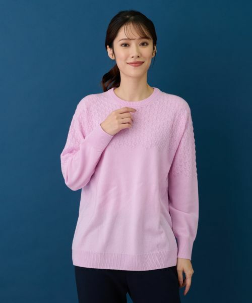 ウォッシャブルカシミヤのニット。特殊な加工を施し、ご自宅での洗濯を可能にしています。身頃上部に幾何柄の編み柄を入れたシンプルなカシミヤニットです。カシミヤらしい優しカラーもポイントです。
